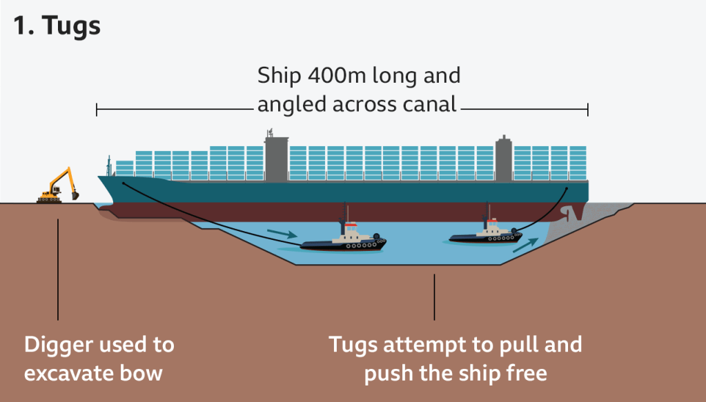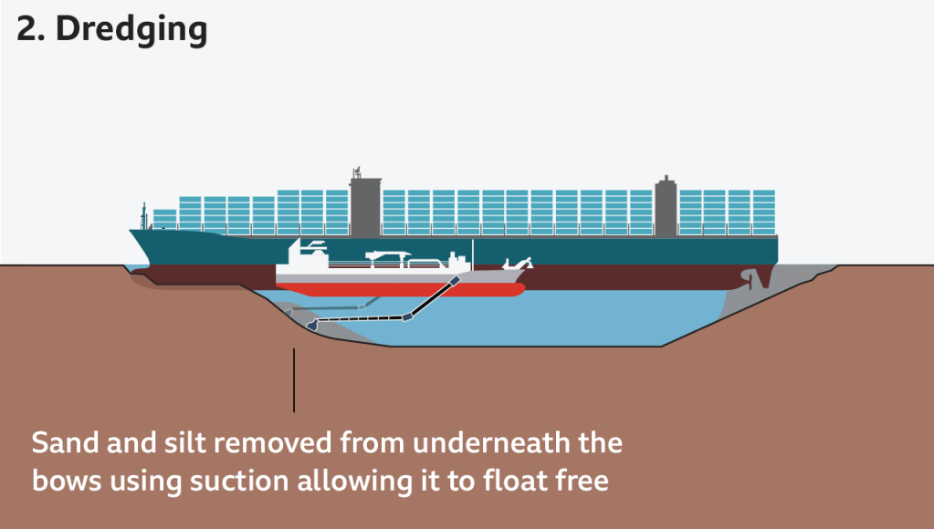 These illustrations from BBC, show how they plan on getting the ship to float. As long as the ship is grounded nothing much can be done. Especially since it weighs 200,000 tones. And that’s why the first step is dredging. They’re focusing on digging out the sand and silt from under the ship.