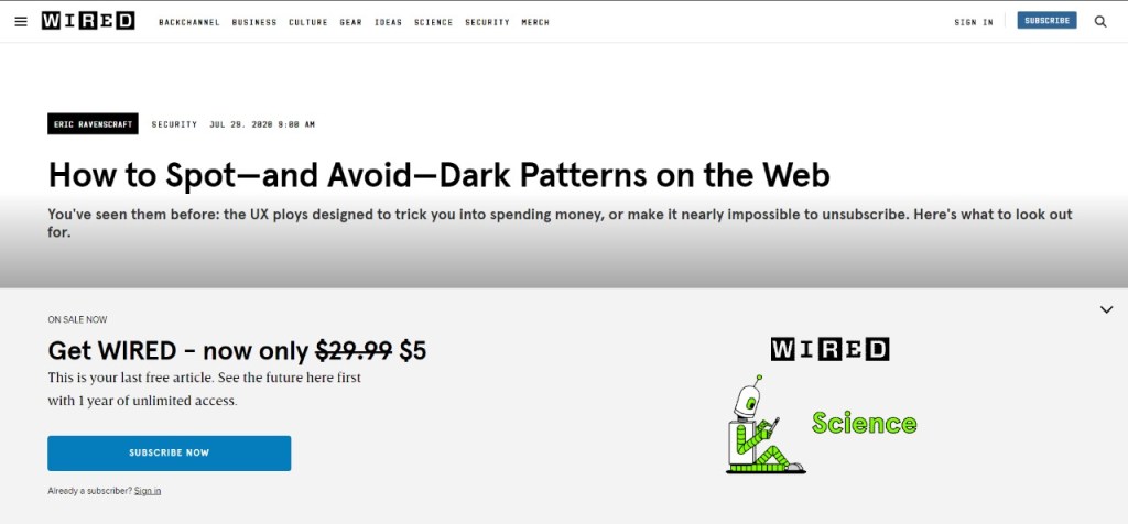 Wired was really committed to helping me spot dark datterns on the web. They weren’t so committed to the avoiding-dark-patterns part though.