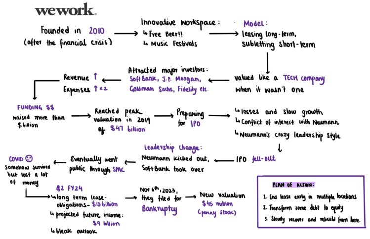 Their model became really popular especially among the younger generation. They expanded within the US and eventually around the globe. The founders positioned WeWork as a tech company rather than a real estate provider, emphasizing the platform’s potential for innovation and disruption in the workplace sector. They raked in funding from various major investors from venture capital firms and banks such as Goldman Sachs, JPMorgan, SoftBank, Fidelity etc. and ended up raising $10 billion.