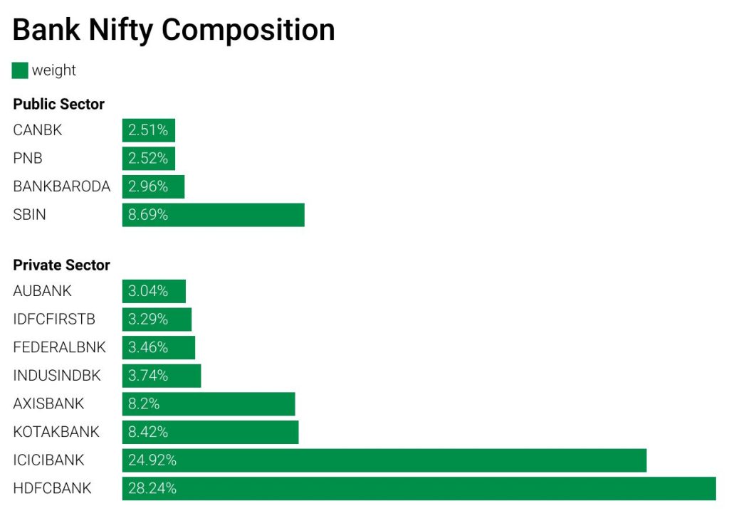 Bank NIFTY is an index that represents the Indian Banking sector’s performance. It includes 12 most liquid and large-cap banking stocks listed on NSE including HDFC Bank, ICICI, Axis Bank, SBI, etc. Even out of these 12 stocks, the top 5 stocks make up 82%.