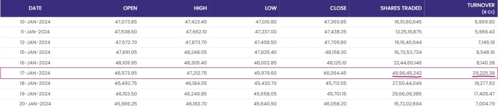It’s actually quite interesting to see the volumes and graphs for the dates that SEBI has identified where “illegal gains” were made by Jane Street. Here are some graphs for January 17th, 2024.