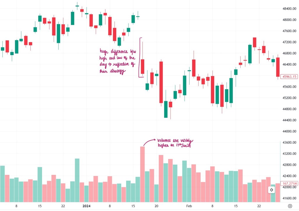 Jan 17th was an expiry day, which means whatever the closing price of Bank Nifty is that afternoon, determines whether they win or lose money on their options.